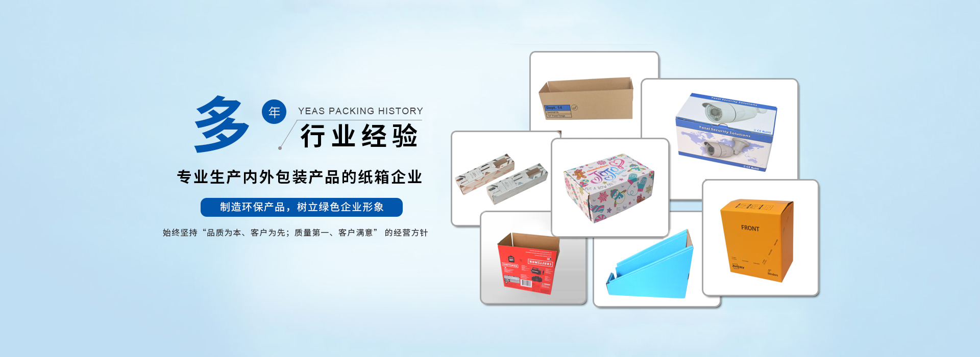 我司主要生產(chǎn)瓦楞紙箱、隔板,禮品盒、彩盒,啤盒;啤卡 ,紙護(hù)角 ,紙卡板,說明書,不干膠,珍珠棉,輔助包材集生產(chǎn)和銷售于一體;公司在材料采購、生產(chǎn)控制、成品檢驗、售后服務(wù)包裝需求嚴(yán)格執(zhí)行ISO9001質(zhì)量體系標(biāo)準(zhǔn);我公司目前為SONY,欣旺達(dá)電子,嘉盛照明,庫偉實業(yè),洲明節(jié)能科技; 泛美照明科技, 怡化金融設(shè)備,美利龍餐具,中天世紀(jì),東芝電器 ,共進(jìn)電子等大中型企業(yè)公司配套供應(yīng)包裝紙箱,建立了穩(wěn)定的合作關(guān)系。